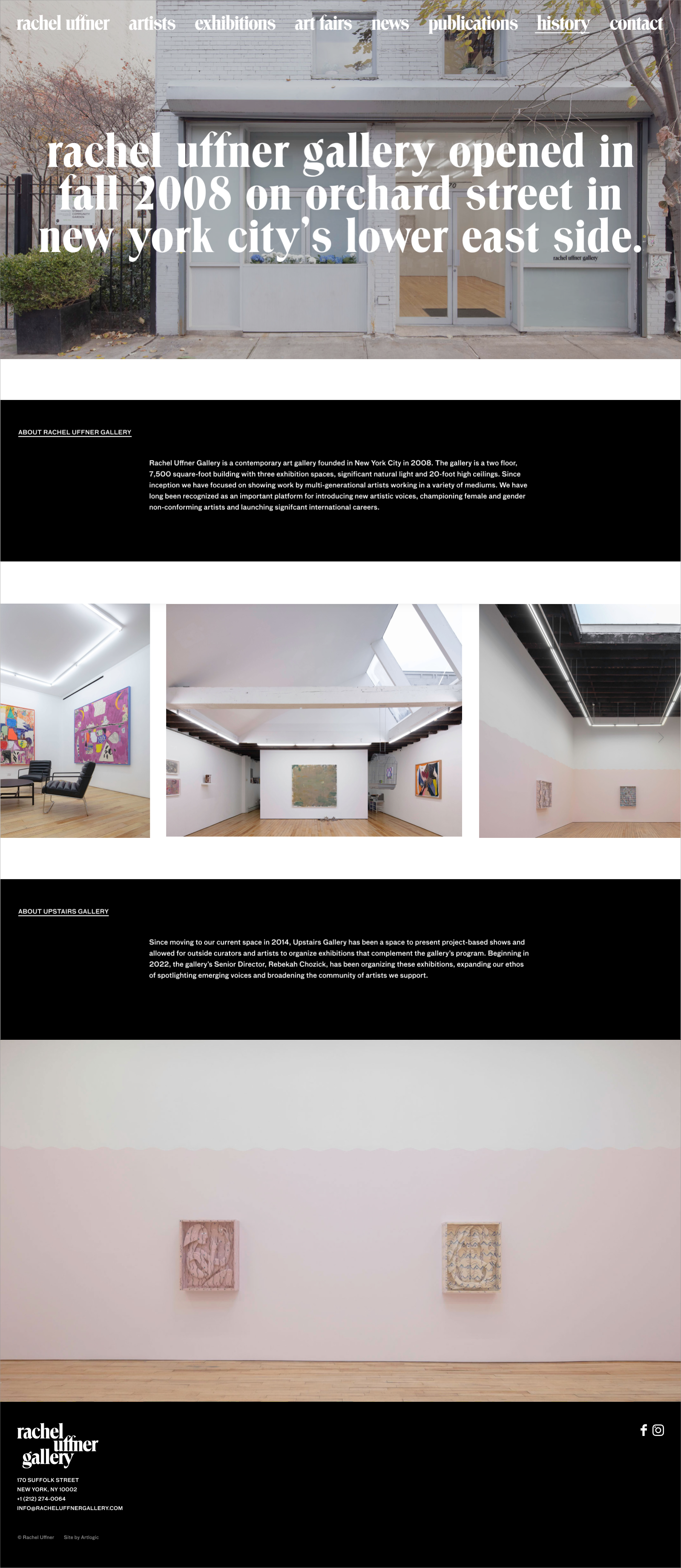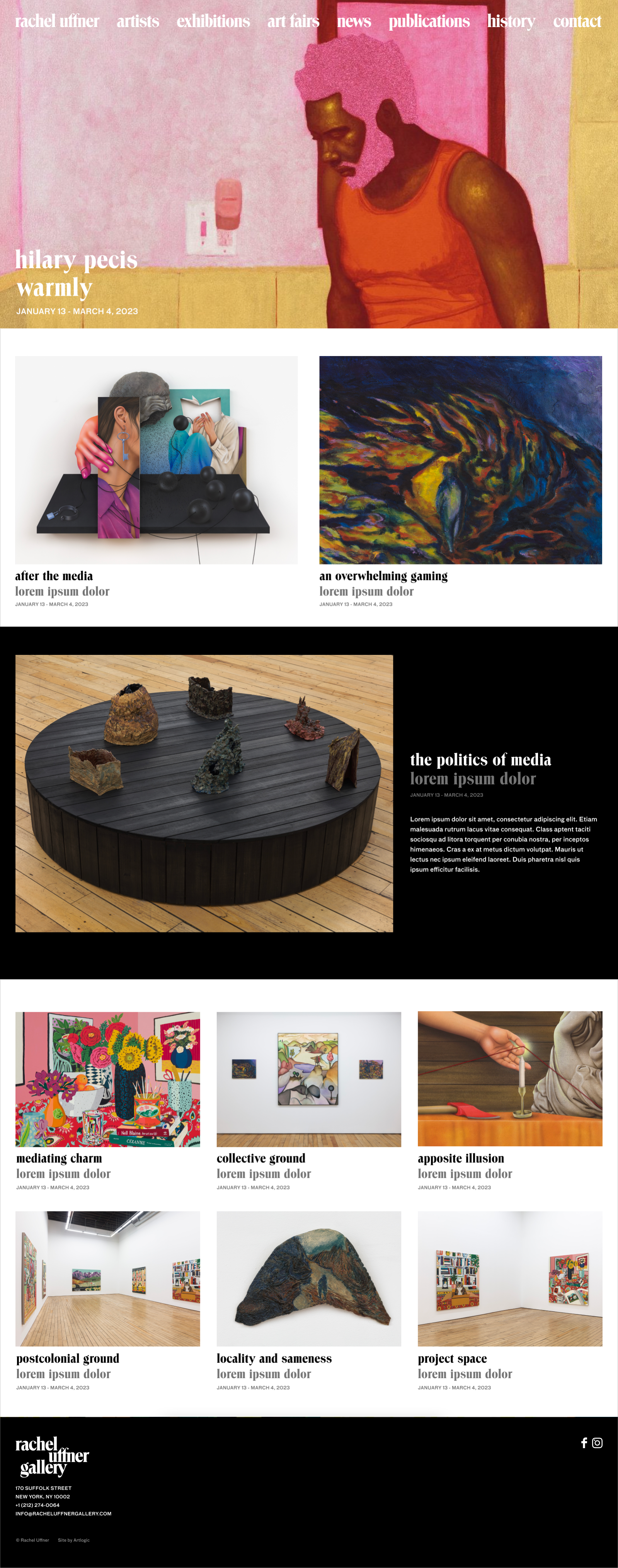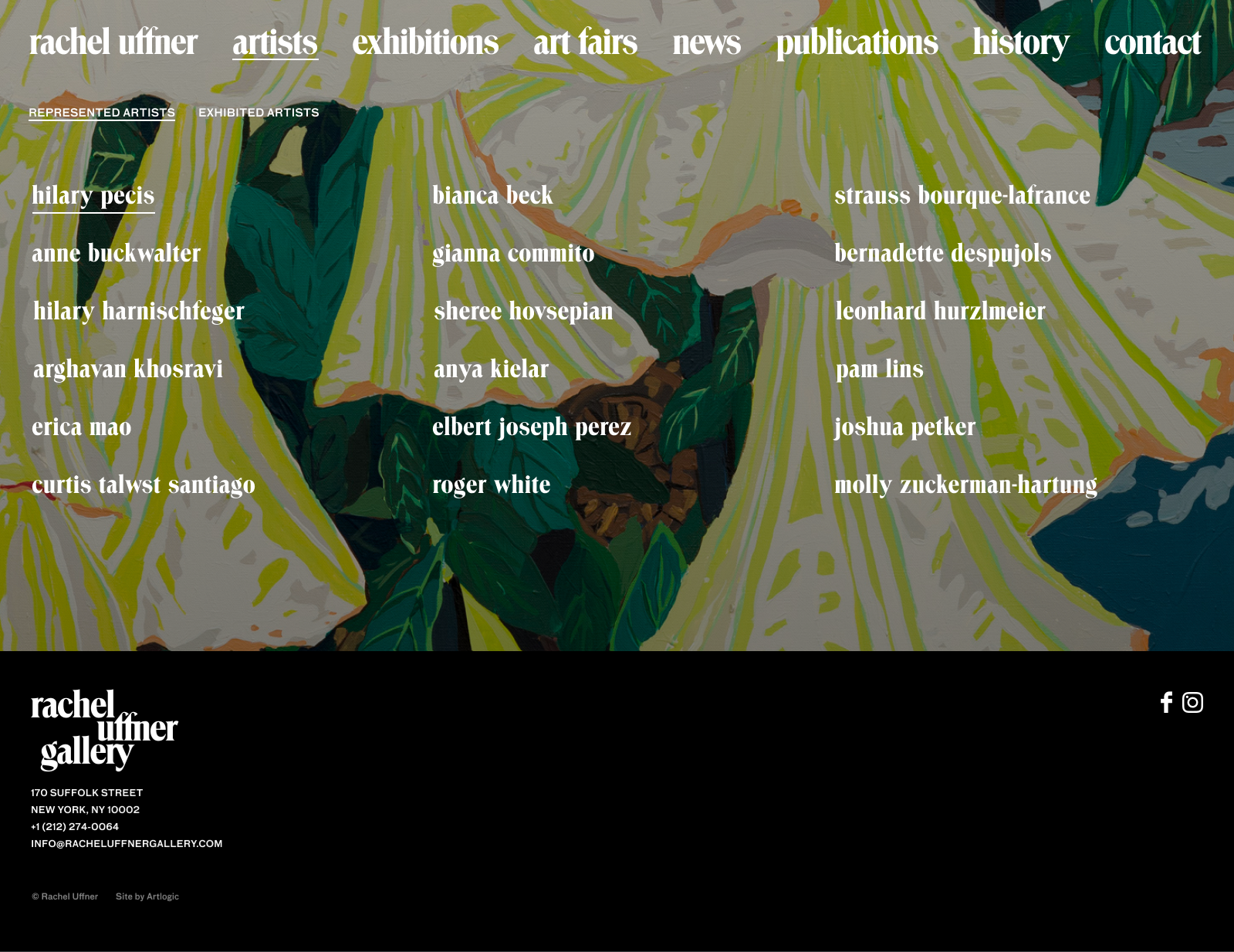 Most galleries maintain long lists of artists they showcase, but Rachel Uffner Gallery, a long-standing presence in the art world, takes a different approach. With a carefully curated roster of artists, we can shift the focus from the names to their beautiful imagery by applying a simple rollover which reveals a full bleed image.